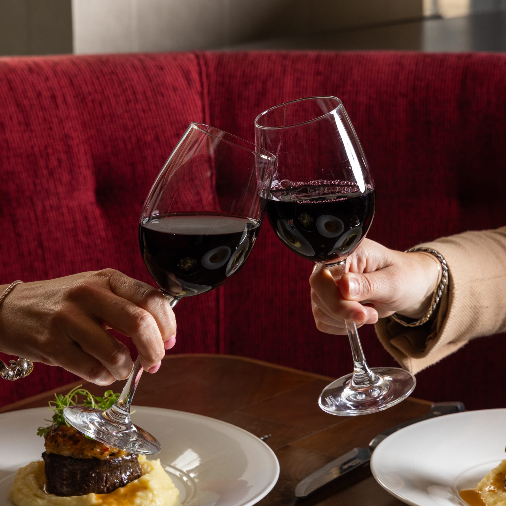 Michael Jordan’s Steakhouse elevates Valentine’s Day with an elegant four-course dinner for two priced at $225. The experience opens with a roasted oyster amuse accented by parsnip aioli, charred lemon butter, and preserved Meyer lemon, followed by a choice of Caesar salad or creamy lobster bisque. The centerpiece is a tableside chateaubriand for two, presented on the signature Steaksmanship board with trio sauces and optional enhancements including shrimp scampi (+$22) or lobster tail (+$34). Cast-iron sides for the table and a traditional chocolate mousse for two complete the evening, with optional pairings such as the “Love You Bunches” Rosé (glass $15, bottle $55) or the Chocolate Cherry Kiss cocktail ($18).