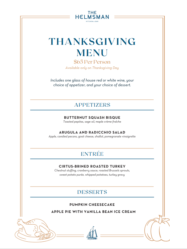 Embark on a culinary journey this holiday season. Join us for a special Thanksgiving Dinner at The Helmsman Kitchen & Bar, featuring a delectable three-course tasting menu featuring twists on classic dishes like butternut squash bisque and citrus-brined roasted turkey. $65 per person Includes one glass of house wine.