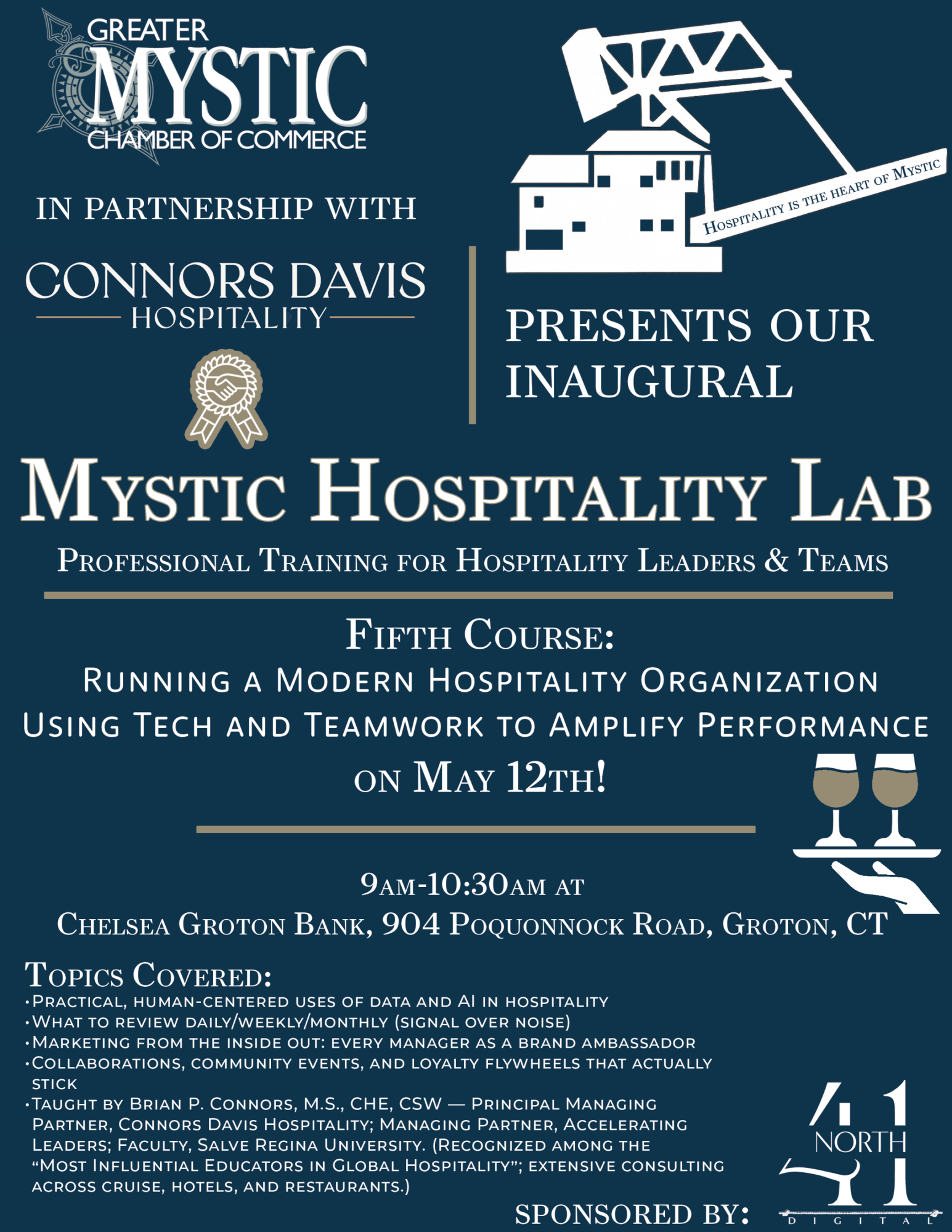 Brian P. Connors, M.S., CHE, CSW — Principal Managing Partner, Connors Davis Hospitality; Managing Partner, Accelerating Leaders; Faculty, Salve Regina University. (Recognized among the “Most Influential Educators in Global Hospitality”; extensive consulting across cruise, hotels, and restaurants.)