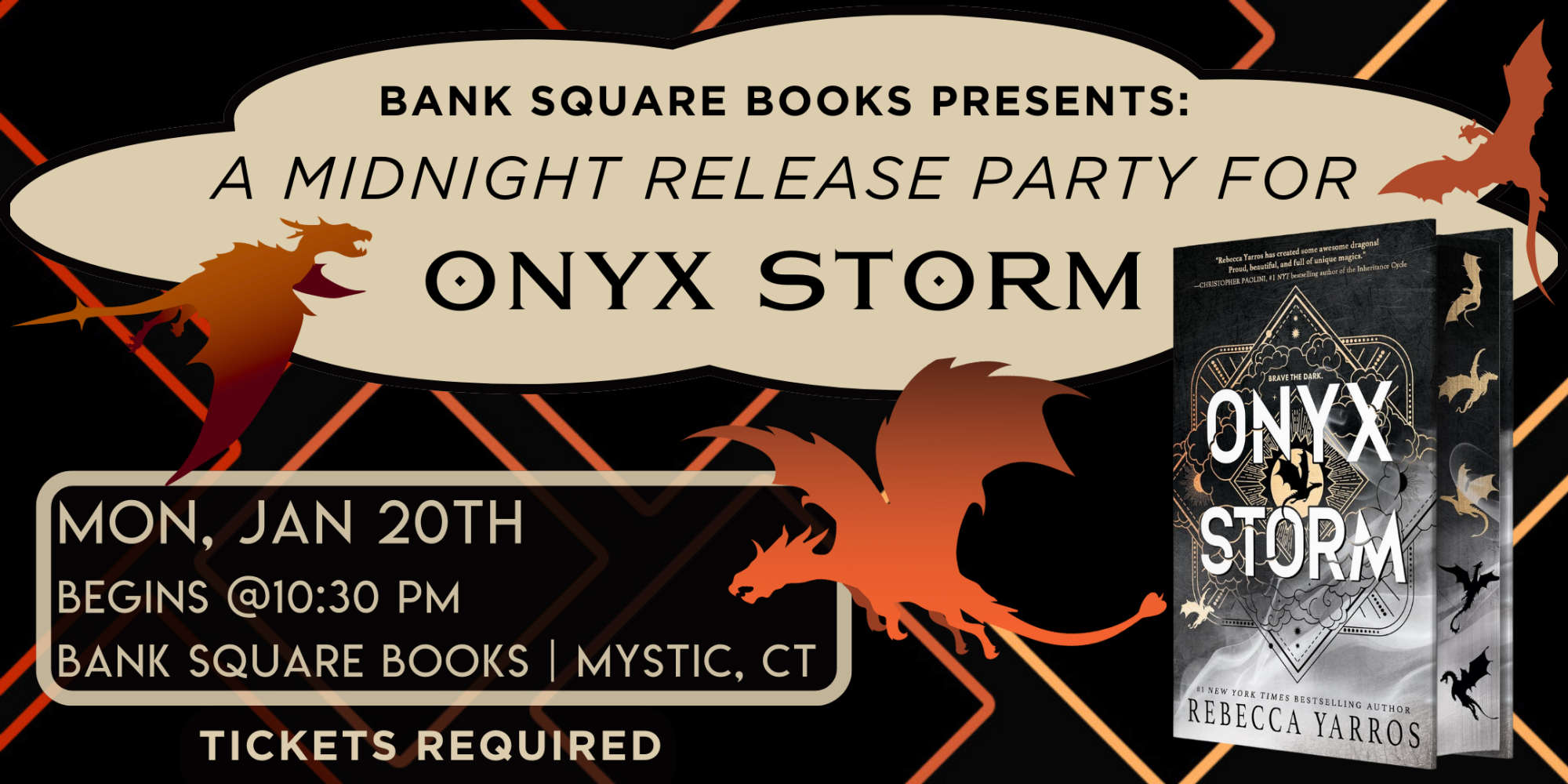 Grab your reader friends and enjoy an evening of FOURTH WING-inspired fun in the hours leading up to the release of the highly anticipated ONYX STORM by #1 NYT bestselling author Rebecca Yarros! There will be games, prizes, and of course copies of ONYX STORM ready for attendees once the clock strikes midnight! There will be a limited number of tickets available for this event. Attending this event gives you exclusive access to the LIMITED FIRST PRINT RUN—featuring spray-painted edges with gorgeously detailed map endpapers. This breathtaking edition is only available for a limited time and while supplies last. Your ticket for this event GUARANTEES a spray-painted edge copy.