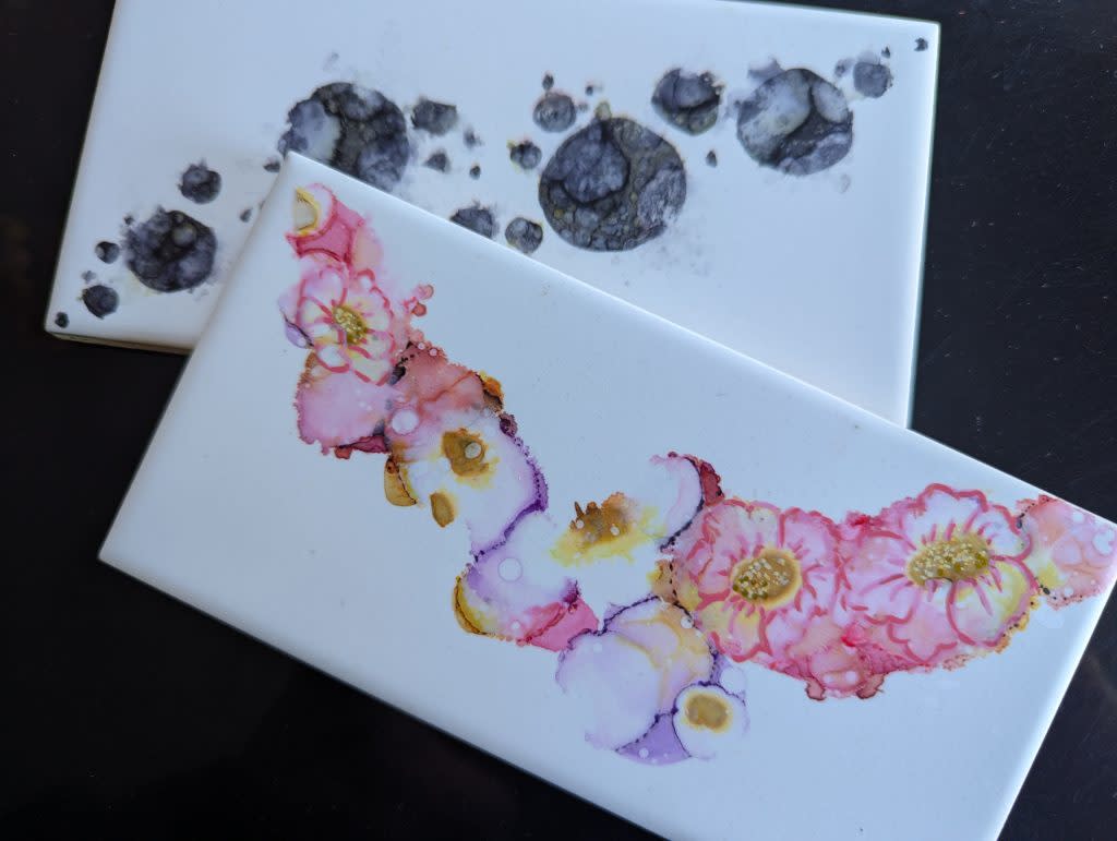 Have fun with vibrant alcohol inks! Drop and swirl colors on a smooth ceramic tile and watch them dance and blend into magical patterns. Tilt, blow, or guide the ink to create a look that’s all your own. Once dry, leave your tile as a bold abstract piece, or add simple line drawings to bring shapes and details to life. Each creation is a cheerful little work of art ready to display and enjoy.