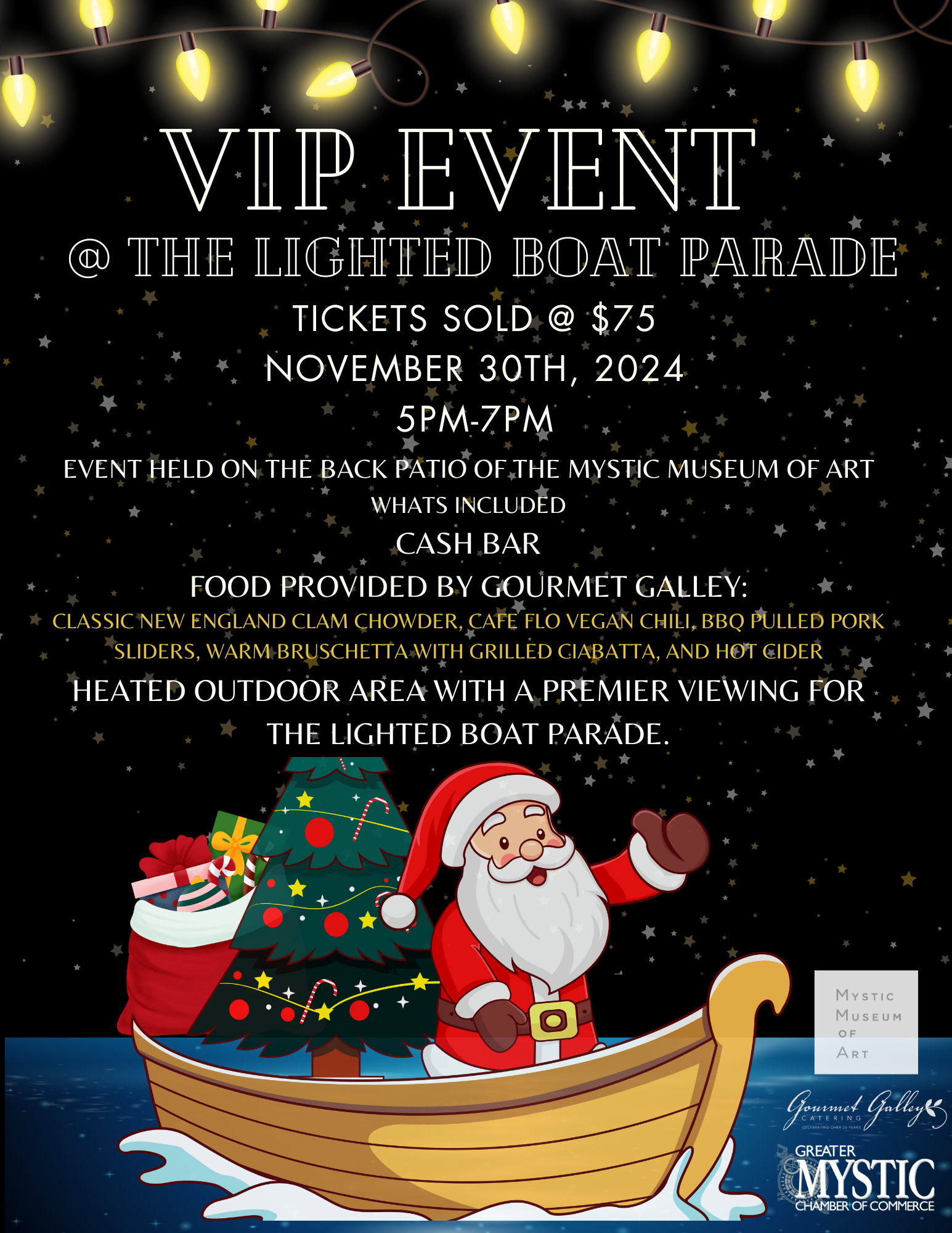 View the beloved Greater Mystic Chamber of Commerce Lighted Boat Parade from the riverside patio of the Mystic Museum of Art. This VIP event will give you access to an unencumbered area to view the parade, food provided by Gourmet Galley and heaters to keep warm. There will be cider provided with your admission and a cash bar available.