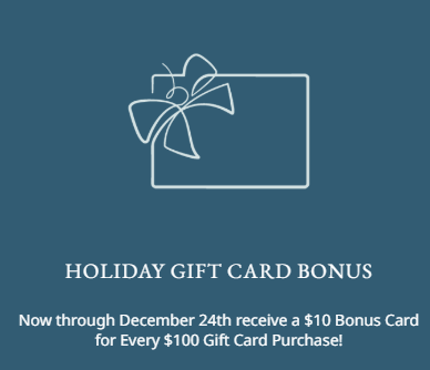 Now through December 24th receive a $10 Bonus Card for Every $100 Gift Card Purchase! BONUS OFFER: Buy $1000, Get $150!