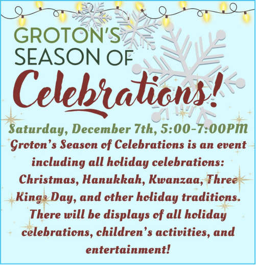 Groton’s Season of Celebration is an event that incorporates all holiday celebrations; Christmas, Hanukkah, Kwanzaa, Three Kings as well as other holiday traditions. There will be displays of all the holiday celebrations, children’s activities, entertainment - bell choir, carolers, dancers, hayrides, special guests and food trucks. Plus special guests!