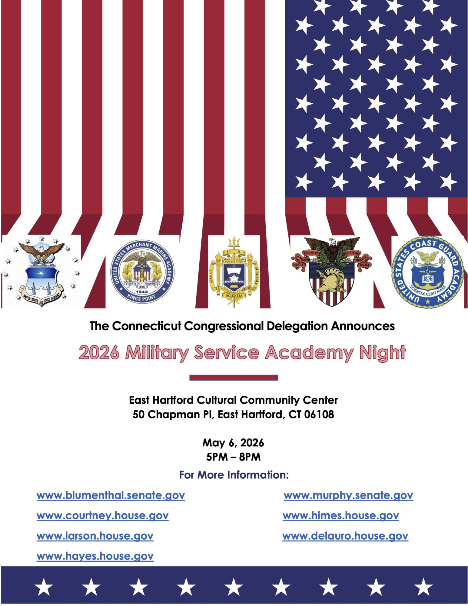Congressman Courtney and the CT Congressional Delegation have scheduled a Military Service Academy Night on the evening of May 6th in East Hartford. Students and parent attendees will learn about admission requirements for the Military Service Academies such as West Point, Air Force Academy, Coast Guard Academy and the Naval Academy. Students planning to apply to a Military Academy are strongly encouraged to attend.