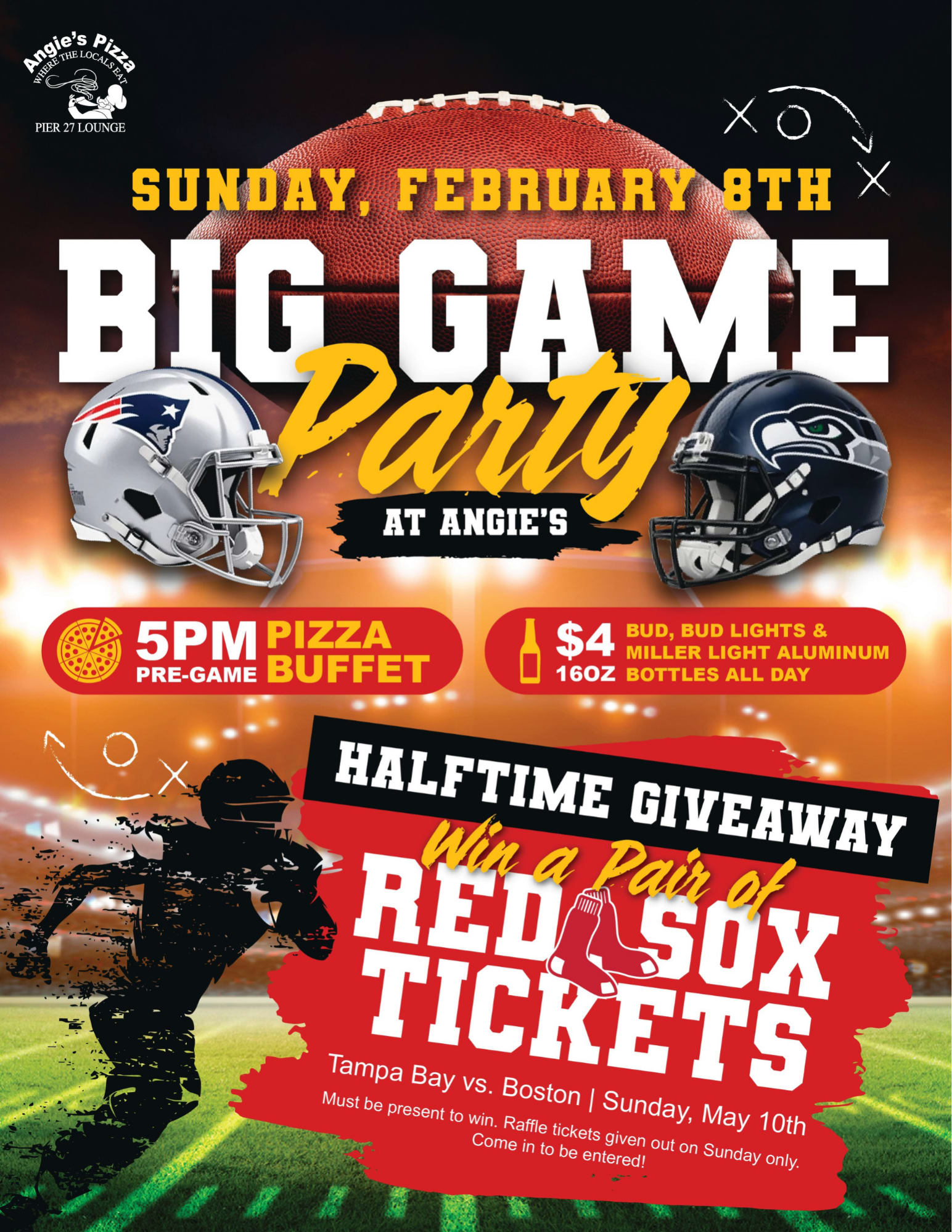 Pre Game at 5pm - Pizza Buffet $4 Bud, Bud Lights and Aluminum Bottles All Day. Halftime Giveaway - Red Sox Tickets vs. Tampa Bay - May 10th.