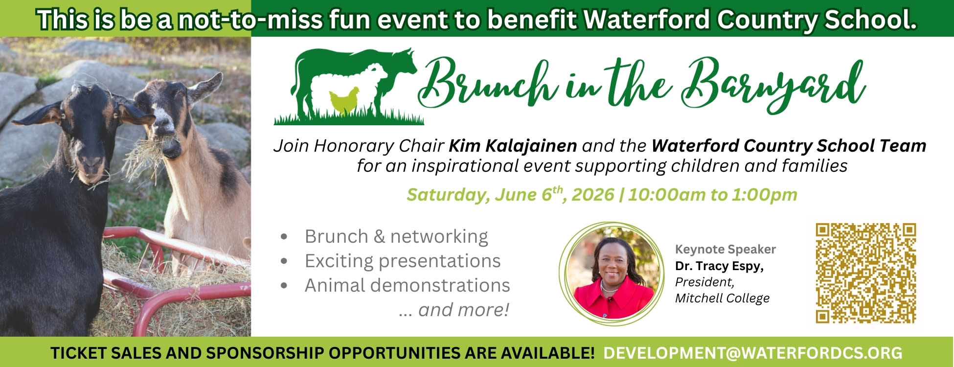 Join us for the 2nd Annual Brunch in the Barnyard, a special event celebrating the impactful work of Waterford Country School. Enjoy a delicious brunch, inspiring speakers, exciting animal demonstrations, and the unique opportunity to experience the WCS farm up close.