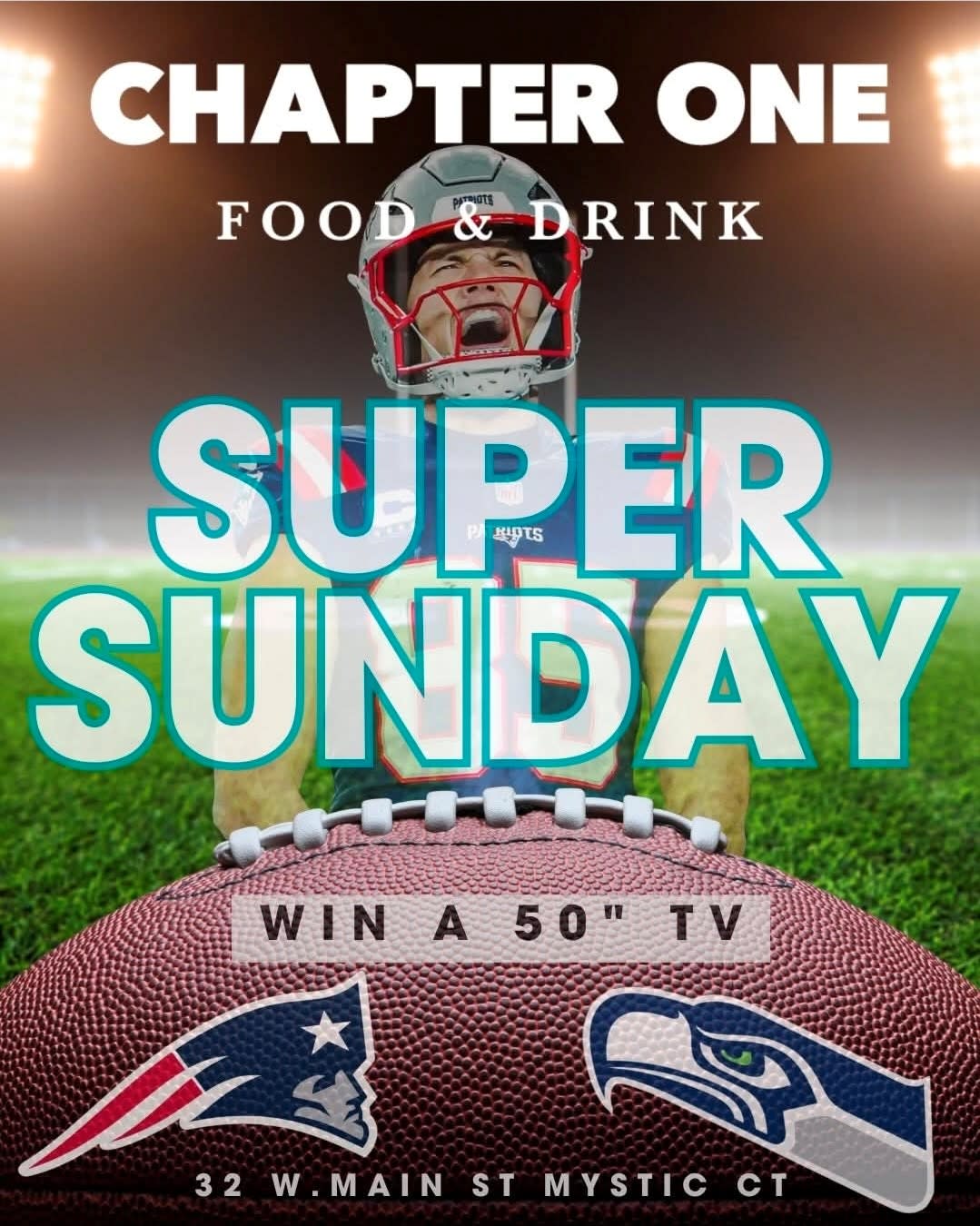Join Chapter ONE in Downtown mystic for the BIG GAME! Sunday, February 8th - 6:30pm. ● 4 televisions to watch all the action.●Tailgate Platter - wings, onion rings & pretzel bites! 🍺Drink Sun Cruisers, Angry Orchard & Sam Adams - WIN PRIZES! ♦️50” Flatscreen TV PRIZE 🏈Chapter One Gift Card ♦️Mohegan Sun Tickets 🏈Sun Cruiser Snowboard