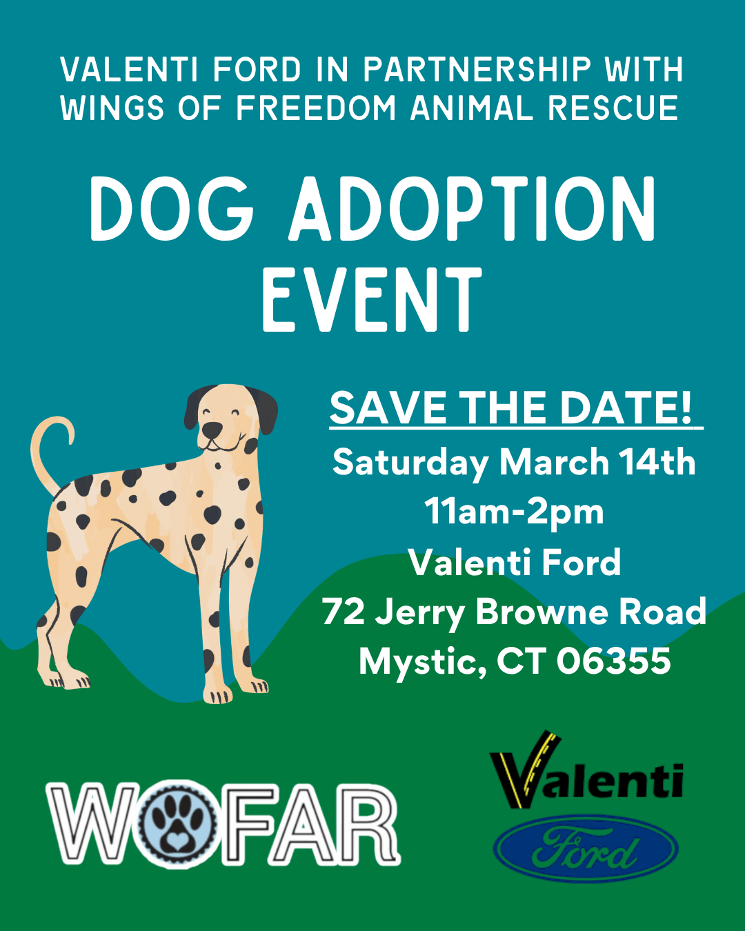 Come adopt a dog šŸ• In partnership with Wings of Freedom! Save the Date: Saturday March 14th 11am - 2pm