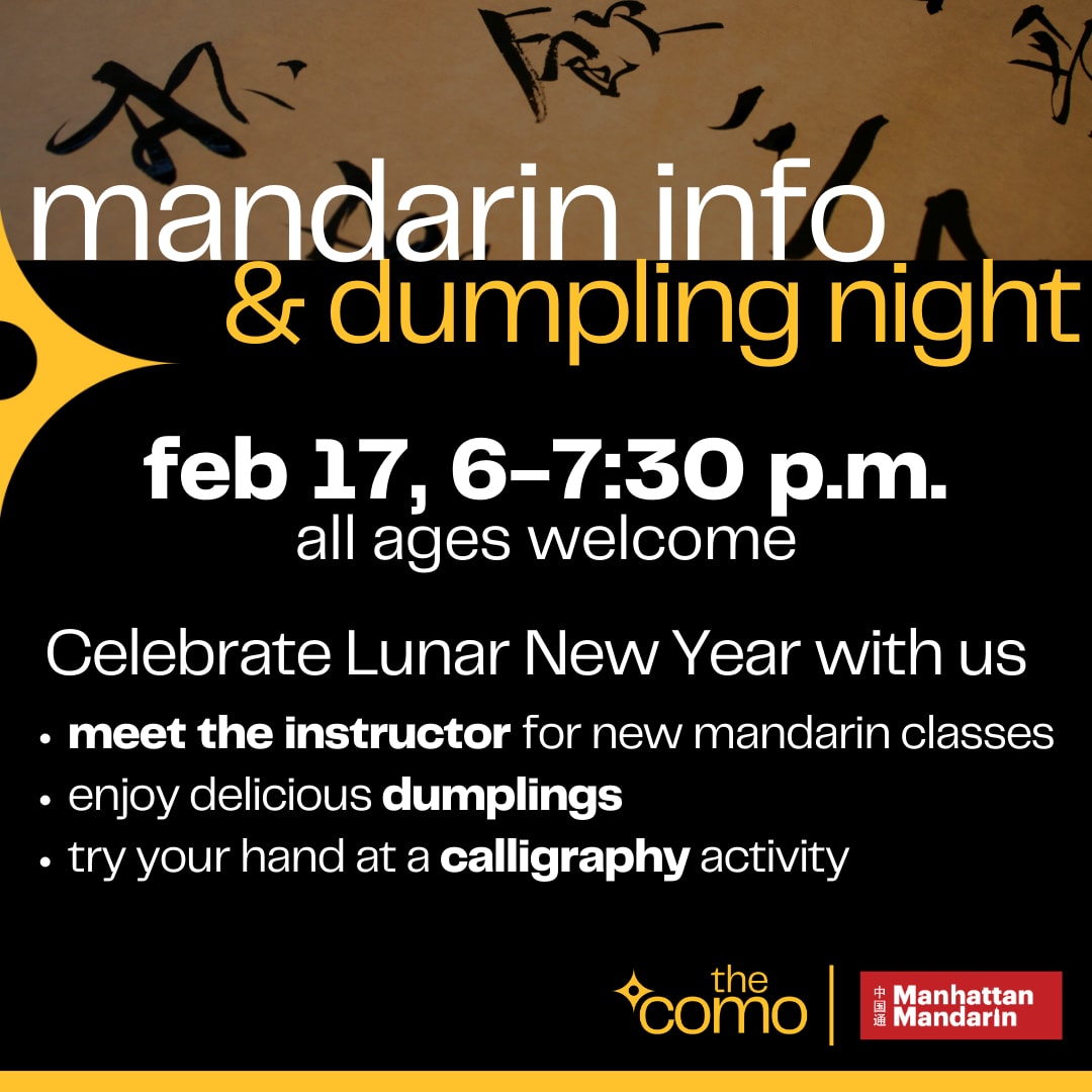 The COMO is excited to introduce a new 12-week Mandarin class, for youth and adults, this March! Celebrate Lunar New Year at the Mandarin Info & Dumpling Night on Tuesday, February 17 from 6-7:30 p.m. Join us in the COMO Auditorium to learn about the upcoming class, meet the instructor from Manhattan Mandarin, enjoy delicious dumplings, and try your hand at a calligraphy activity. It's useful to learn Mandarin to add to your resume, expand your cultural understanding, flex your focus and memory skills, and be able to communicate with the billion people who speak it around the world!