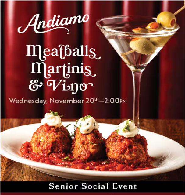 Join us for an afternoon of nostalgia at Andiamo restaurant! Seniors, sip on two drinks while indulging in passed Hors d'oeuvre, all accompanied by live entertainment. Let's make memories together!