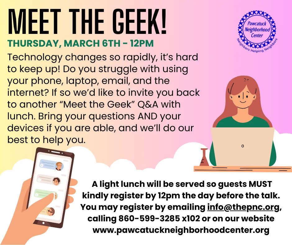 Our last Meet the Geek Q&A was very popular, so we’re going to do it again. Join us and bring your questions about your phones, tablets, laptops, email, the internet, or any other type of technology that is troubling you. We will do our best to help you out, and enjoy lunch and each other’s company.
