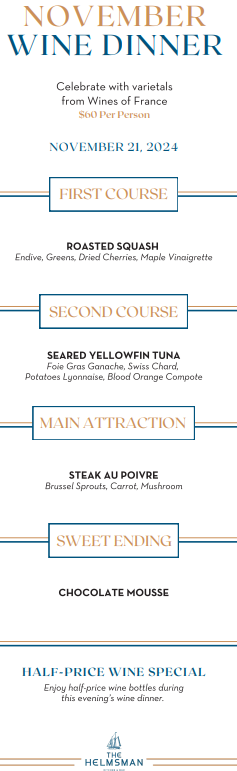 Come join us for a 4 course meal with a wine glass for each course Varietals from Wines of France presented by Brescome Distributors. For only $60, Starts at 5pm Joe Gennaro will take you step by step on the difference wine pairings and origins. Seating is limited so reserve now on OpenTable. Any questions please call us at 860-326-0360.