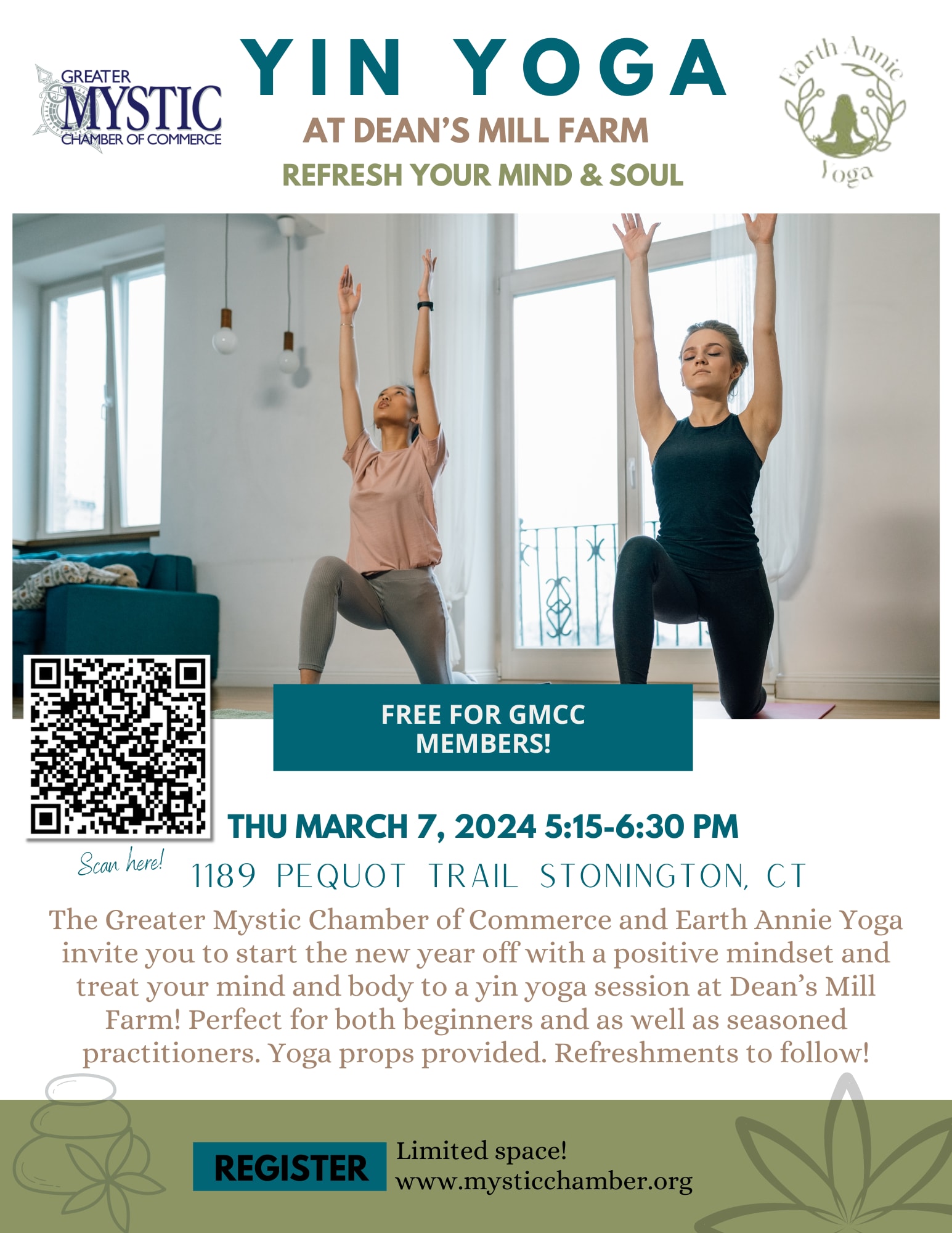 The Greater Mystic Chamber of Commerce and Earth Annie Yoga invite our members to start the new year off with a positive mindset and treat your mind and body to a free yin yoga session at Dean's Mill Farm! Perfect for both beginners and as well as seasoned practitioners. Yoga props provided. Refreshments to follow!