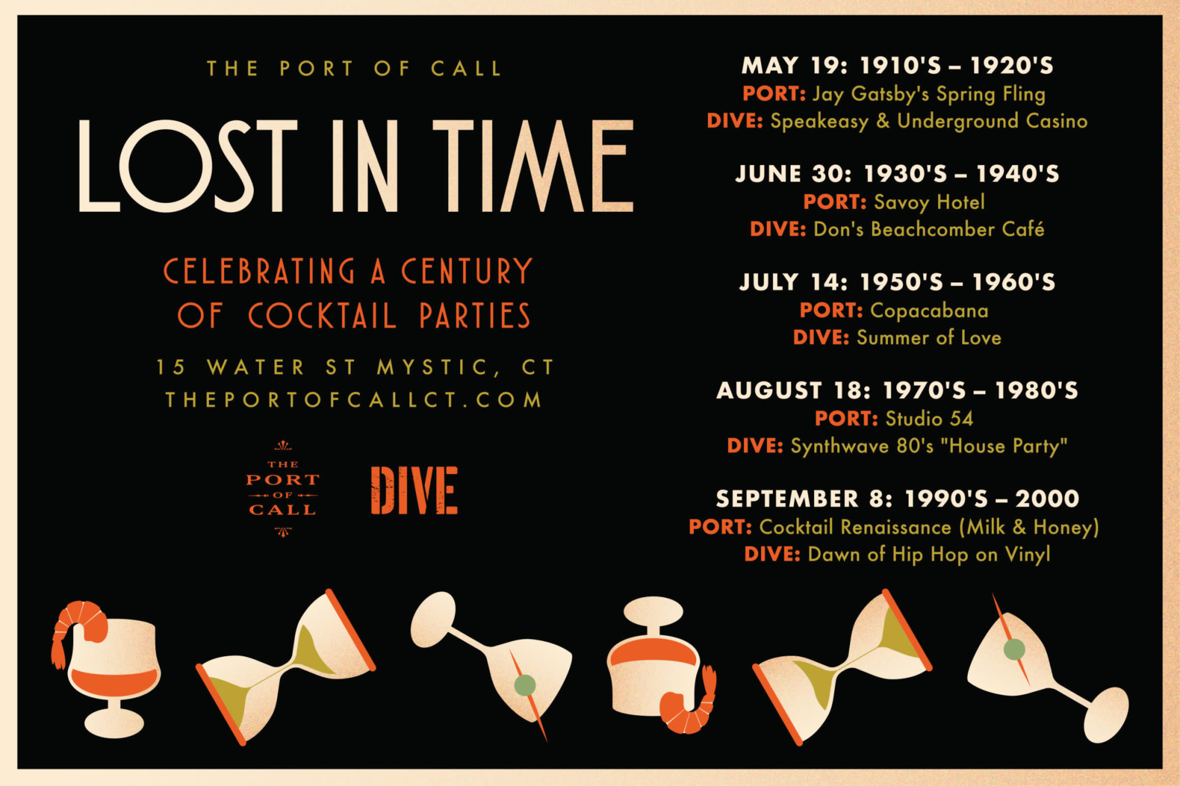 DESCRIPTION:The Port of Call in Mystic unveils Lost In Time\, a new series that celebrates a century of cocktail parties.Each journey through time will include a taste of the era's culinary delights\, curated by James Beard nominee Chef Renee Touponce. Continuing the Lost in Time concept throughout the year are the following Monday evening dates and themes for Port upstairs and below deck at Dive\, each with a curated food and cocktail menu:June 30th: 1930s - 1940s: Port: Savoy Hotel | Dive: Don's Beachcomber Caf July 14th: 1950s - 1960s: Port: Copacabana |Dive: Summer of LoveAugust 18th: 1970s - 1980s\; Port: Studio 54 | Dive: Synthwave 80's "House Party"September 8: 1990s - 2000s: Port: Cocktail Renaissance (Milk & Honey) | Dive: Dawn of Hip Hop on Vinyl