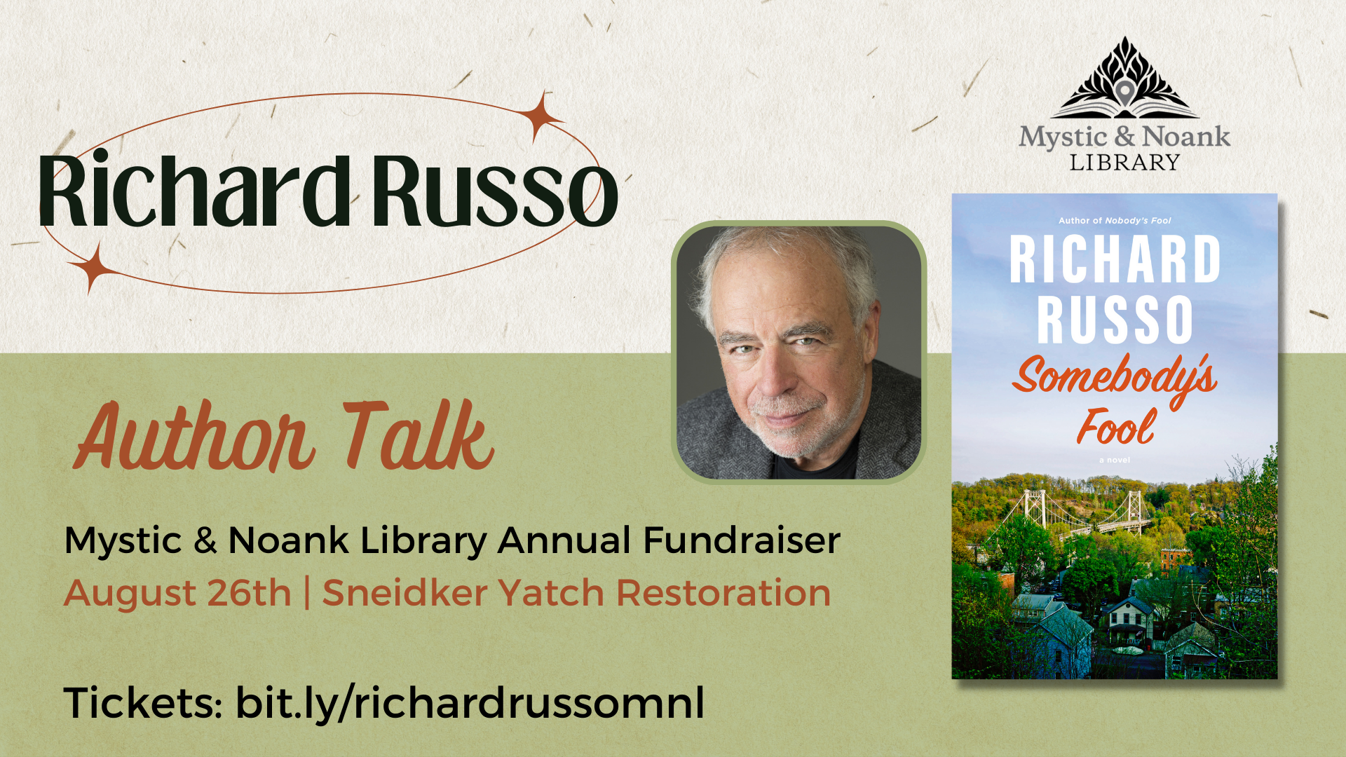 Please save the date for a very special literary event featuring Pulitzer Prize winning author Richard Russo. He will be in conversation with Rick Koster of The Day for his new book, Somebody's Fool. This ticketed event is part of our 2023 Annual Fundraiser to benefit the Mystic & Noank Library, and will kindly be hosted by Snediker Yacht Restoration.