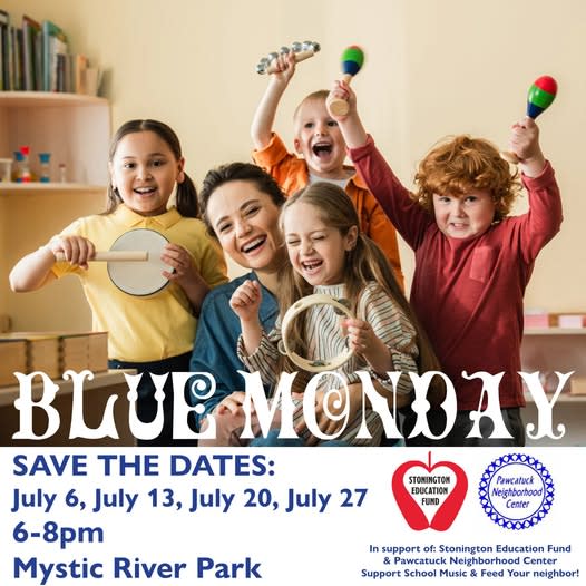 Blue Monday Concerts return to Mystic River Park for four free concerts beginning Monday July 6th, 6:00 PM to 8:00PM. The concert series is a fundraiser for the Stonington Education Fund and the Pawcatuck Neighborhood Center.