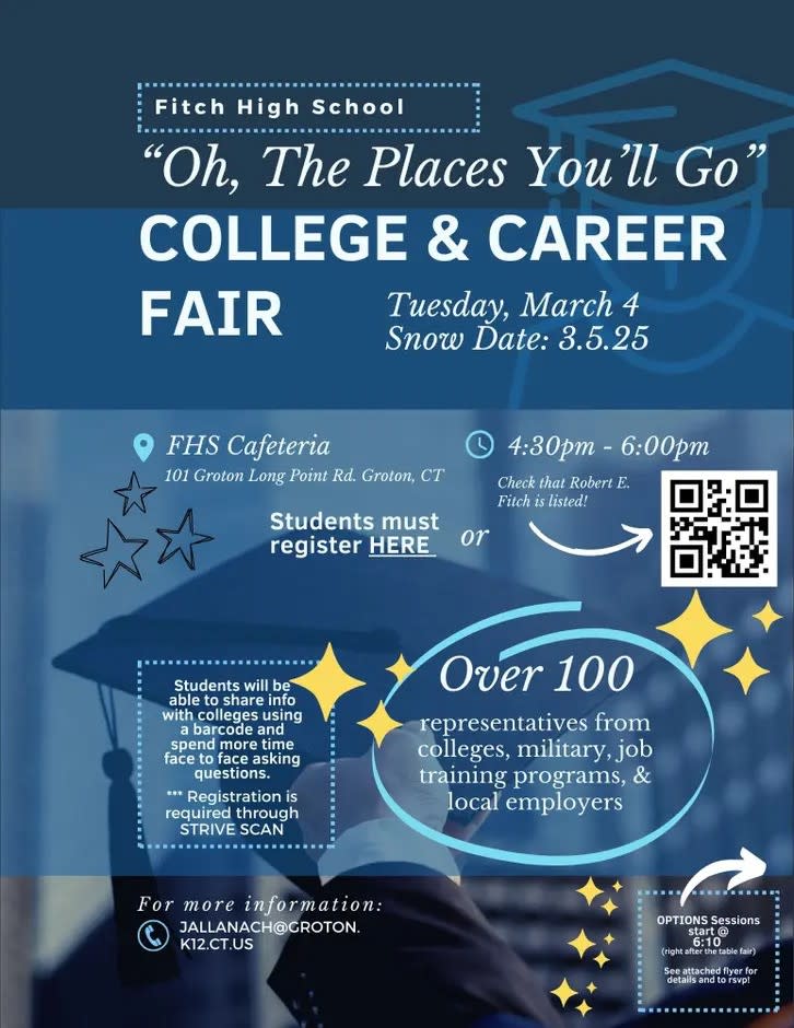 FHS annual, "Oh, The Places You'll Go, College & Career Fair". More than 100 colleges, community members and military staff!Table set-ups are 4:30 pm - 6:00 pm. Information sessions & presentations will run from 5:50 or 6:10 pm until 7:00 pm. Table set-ups for community, military, and college representatives from 4:30 pm - 6:00 pm Presentations(after the table fair- all grades welcome):5:50-6:25pm Intro to financial aid hosted by Holly Franquet (non-profit ECMC The College Place- All grades welcome)6:30-7:00pm Intro to the College Process hosted by UCONN (ALL grades welcome~ Juniors THIS is for YOU)6:10-7:00pm FREE job training through EWIB & YMPI6:10-7:00pm ROTC Scholarship Info presented by Air Force ***For a list of registered institutions publicly, please click List of Colleges Attending (changes daily). IF you have questions, concerns, thoughts, please reach out anytime. Please register at or strivefair.com and enter 3.5(Robert E. Fitch High School as the location).FHS is partnering with STRIVE SCAN, in an effort to increase efficiency and allow for more conversation & question time with the representatives and students. Students will need to sign-up for a barcode (preferably in advance but we will work with students on the day). The students will enter their name high school, grade, and contact information. There is an optional section with more detailed questions like ethnicity, major, etc. , that is NOT required. This barcode will allow students to share their information with any college they choose(instead of handwriting or printing labels) It is a quick, two minute process. Feel free to email to request a PowerPoint to utilize if you are bringing a group of students. We are hoping this will be a great opportunity for all high school students to gain information! Please save the date and share our flyer(attached) with the registration link, if helpful! School Counseling department members will be going into tenth and eleventh grade CTL's on February 7th, 8th, 9th to register students for the fair- this will allow us to send reminders and room assignments for the presentations to whomever registers.