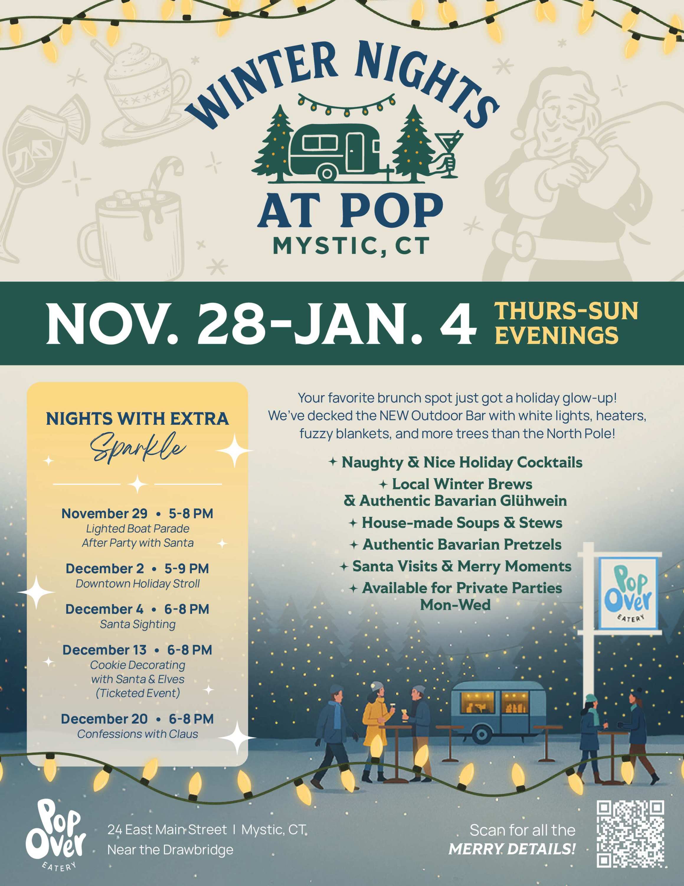 While Mystic’s Downtown Holiday Stroll lights up the streets, Pop Over is one stop you won’t want to miss. Warm up with a seasonal beverage, take in the cozy glow of our Winter Nights outdoor bar, rest your feet between shops, and say hello to Santa, the star of our Stroll stop! Make Pop Over part of your holiday night in downtown Mystic.