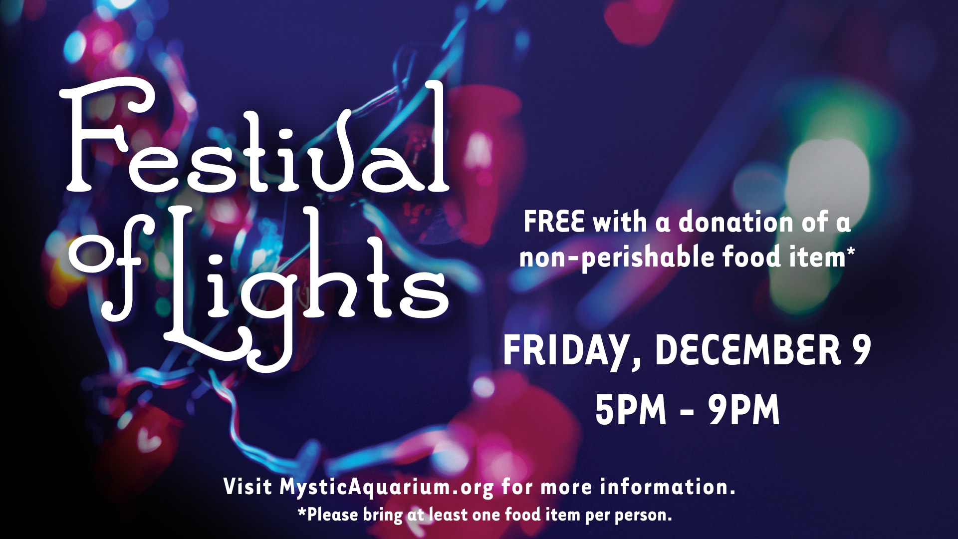 A Mystic holiday tradition that is not to be missed, the annual Festival of Lights celebration will take place on Friday, December 9th! From 5pm to 9pm, Mystic Aquarium will grant free entry with the donation of a non-perishable food item (in lieu of a food item, cash donations will also be accepted for entry). Aquarium visitors will enjoy the cheer of holiday lights and sounds, community performances, diving elves, a visit from New England Dairy’s Mobile Dairy Bar, and of course, many of our Mystic Aquarium animals! Please note that due to construction, some areas of Mystic Aquarium will be closed, and the number of guests entering per hour will be limited.