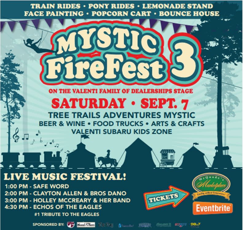 3rd Annual Firefest benefit for Mystic first responders. 4 Bands featuring the national touring group Echos of the Eagles the #1 Tribute to the Eagles spanning 50 years of Eagle's greatest hits, along with from Alabma Holley McCreary & her band plus more. Food Trucks, art & craft vendors, children activities, beer & wine garden.