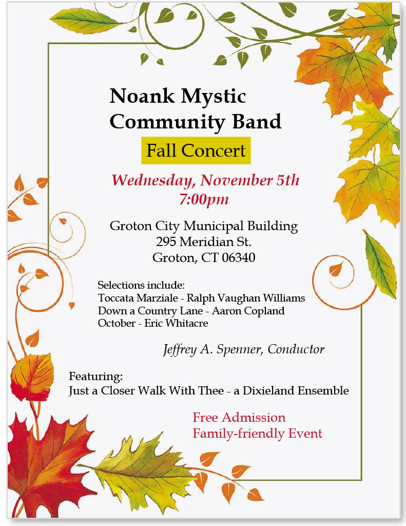The Noank-Mystic Community Band, under the direction of Jeff Spenner, will present a Fall concert. on November 5 at 7 PM. A wide variety of music will be performed, from Sousa's "Homeward Bound" march, to "The Hunchback of Notre Dame" highlights, to Vaughan Williams" "Tocatta Marziale", with Arban's "Carnival of Venice" (with tuba soloist, Blake Taylor) thrown in. Admission is free, and refreshments will be served at intermission. Come join us for a wonderful evening!
