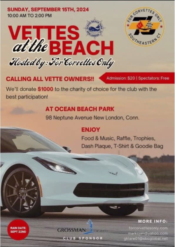 Vettes at the Beach is hosted by For Corvettes Only, based in southeastern Connecticut. This is their 17th annual show. Proceeds to benefit selected local and national charities. Enjoy food, drinks, music and 50/50 raffle. Amusement rides are available for the kids. A Miniature Golf Course and a Game Room is also available for attendees. Participants get t-shirts and goodie bags and they can win trophies,. Unfortunately, no pets, please. Food donations for local Food Banks will be welcomed. Drop off locations will be marked at the event. Celebrity Judges will examine all the beautiful Corvettes and a Trophy Presentation will take place at the end of the show.Images