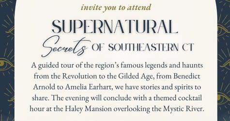Supernatural Secrets of Southeast CT Experience: This dynamic and spooktacular interactive tour experience will take you across our Southeastern CT community known regionally as Mystic Country with stops in Groton, Stonington, Noank & Mystic and within an exceptional haunted mansion as we allow you to travel through time and meet the spirits of the shoreline’s colorful past.