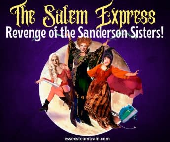 Winifred, Sarah, and Mary Sanderson (Summer Orlando, Miranda Mugovero, and Barbra Joan Streetsand) will entertain you with tales of witches and lore direct from Salem, while bewitching you with a performance you won’t forget, kicking off the Halloween season! Join the magical coven before the train ride for a meet and greet, colorful photo opportunities, and maybe even some special witches brew on the patio. Featuring Summer Orlando: New England’s #1 live singing Winifred Sanderson impersonator, as seen in Disney’s “Hocus Pocus 2!” Dress as your favorite character from the movie or dress to impress in your Halloween best!