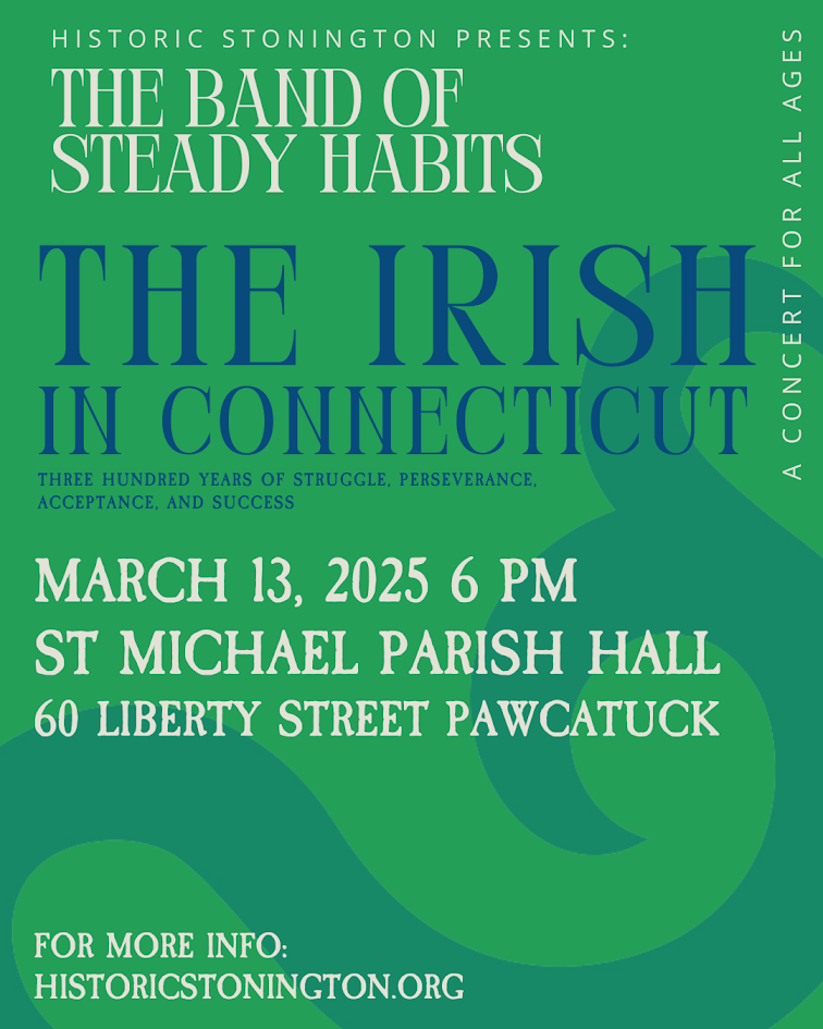 DESCRIPTION:Historic Stonington presents the Band of Steady Habits\, along with a three-century overview of life for the Irish in Connecticut\, from the 1640s to the present. This captivating narrative of struggle\, perseverance\, acceptance\, and success is enhanced by both uplifting and poignant music. Led by Connecticut State Historian Emeritus Walter Woodward\, the Band of Steady Habits employs their musical talents to create a unique public history presentation. The band members Rachel Smith\, Teagan Smith\, Jeremy Teitelbaum\, and Duke York play a variety of instruments\, including banjos\, guitars\, violins\, recorders\, bass\, and percussion\, while delivering beautiful harmonies. They perform both historic and contemporary songs that complement visually rich and evocative historical stories. These stories offer new insights and perspectives on a range of topics\, from the Civil War and the uniqueness of Connecticut to the Irish presence in the state. This event is free\, and everyone is welcome to attend. For more information\, please visit www.historicstonington.org or call 860-535-8445.