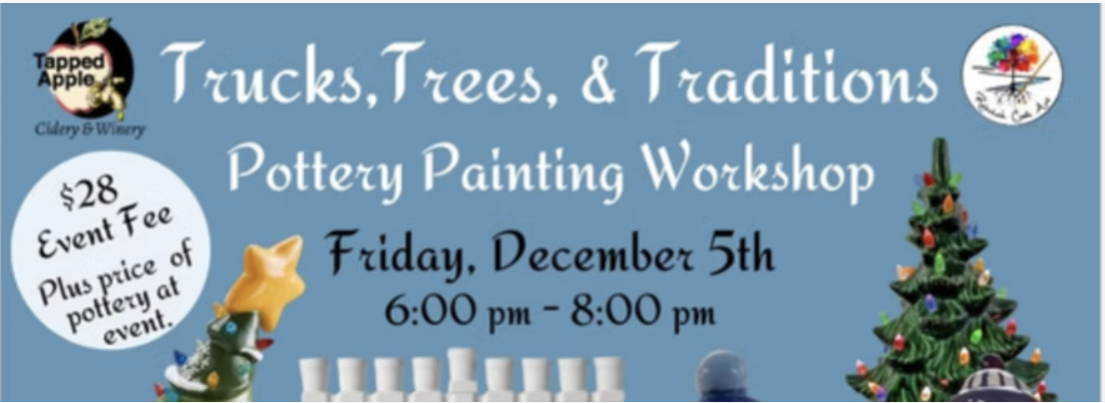 Embrace cherished holiday traditions and add a creative twist at our Paint-Your-Own Pottery Trucks, Trees and Traditions Workshop! Choose from a delightful variety of ceramics — from classic holiday trees to festive cars carrying light-up trees, and more! Personalize your piece with your own colors and style, and we’ll add the lights after kiln firing to make it shine. Your $28 event fee includes the studio fee and a delicious Tapped Apple beverage to enjoy while you paint. Pottery pieces are selected and paid for on the day of the workshop, so you can pick the design that speaks to your holiday spirit.