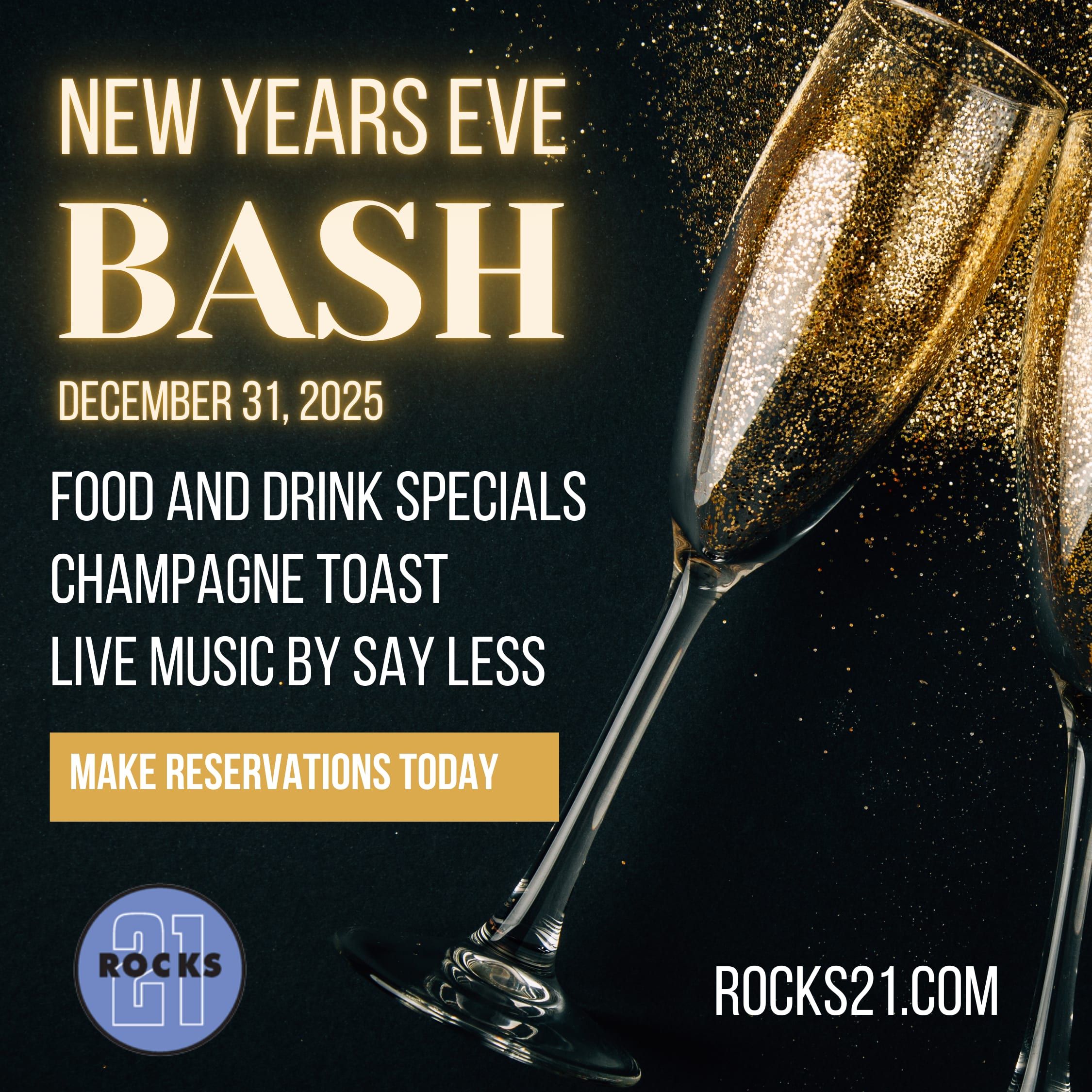 Rocks 21 New Years Eve Bash is Accepting Reservations, Graphic attached, they can make reservations at https://rocks21.com/reserve/ or by calling 860-536-8140