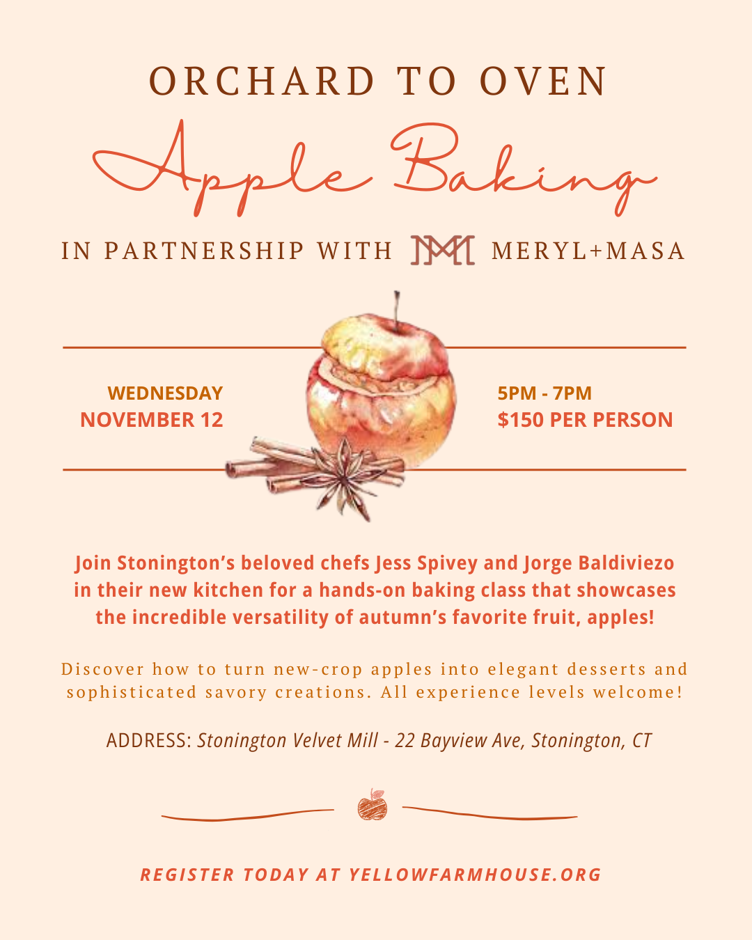 Join Stonington’s beloved chefs Jess Spivey and Jorge Baldiviezo, owners of Stonington’s celebrated Meryl+Masa Sourdough Bakery and Latin Eatery, in their new kitchen for a hands-on baking class that showcases the incredible versatility of autumn's favorite fruit.